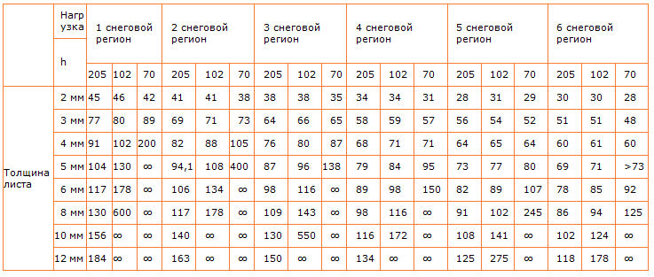Следует отметить, что приведенные расчеты - результат измерений, проведенных на стендах для испытаний, несут только ознакомительный характер, точный расчет конструкции должен выполняться сертифицированными специалистами. Ширина листа 2,05 метра, и для разделения его на одинаковые 2 или 3 части берутся размеры 0,7 и 1,02. Для удобства расчетов можно использовать метод интерполяции.